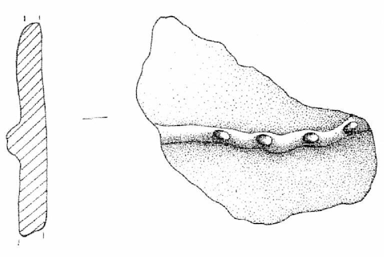 Rettilinea, ornata da un cordone a tacche ad andamento irregolare. Superficie di colore grigio (10 YR 6/1).