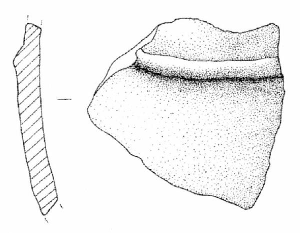Leggermente convessa, decorata da un cordone liscio, orizzontale. Superficie di colore grigio scuro (7,5 R 4/0).