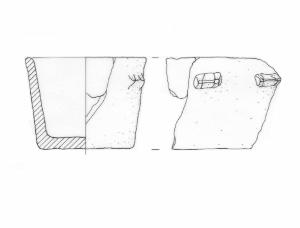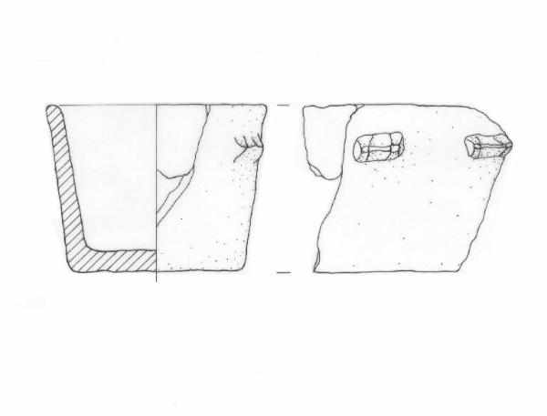 Profilo tronco-conico con orlo lievemente estroflesso e parete decorata con serie di piccole bugne a doppio tubercolo.