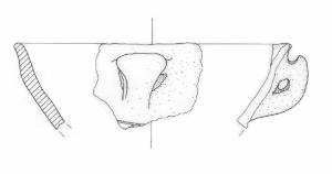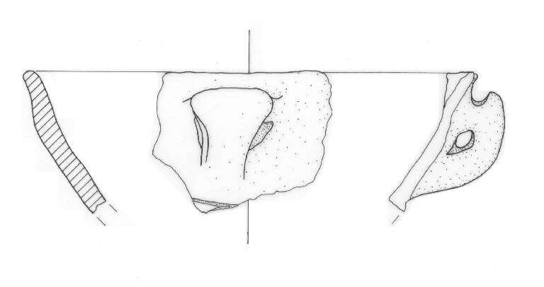 Profilo tronco-conico con orlo lievemente estroflesso e ansa canaliculata con appendice asciforme; decorazione a linee incise immediatamente sotto l'ansa.