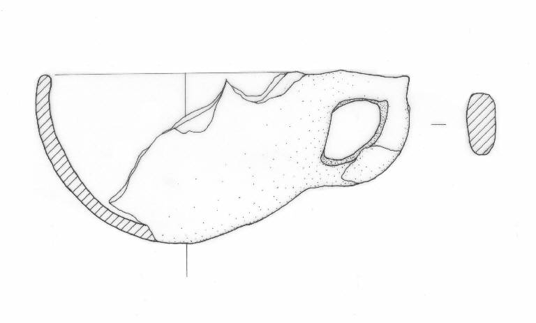 Profilo emisferico con orlo lievemente introflesso, ansa a gomito con leggera appendice asciforme impostata ad altezza orlo, fondo a calotta.