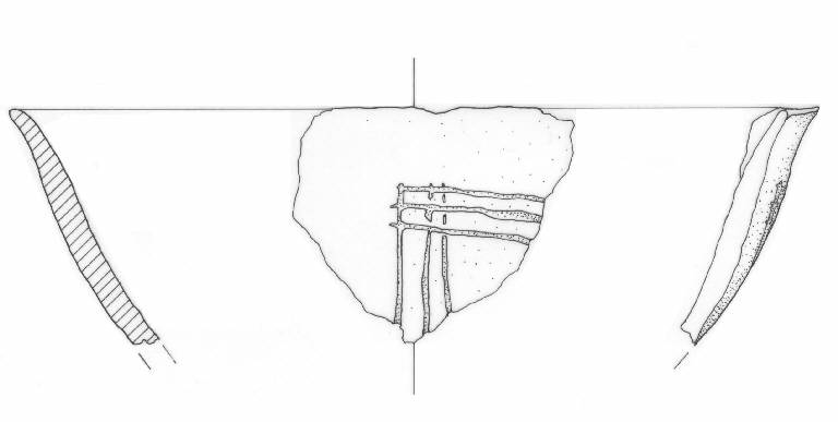 Profilo emisferico con orlo estroflesso; decorazione a serie di linee incise parallele e perpendicolari all'orlo.