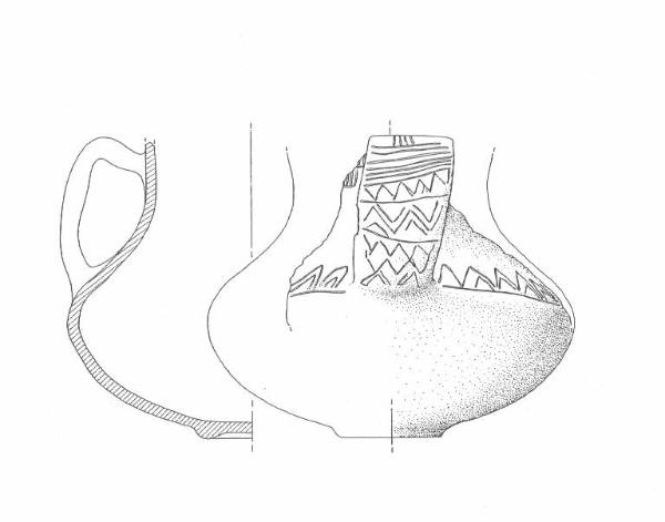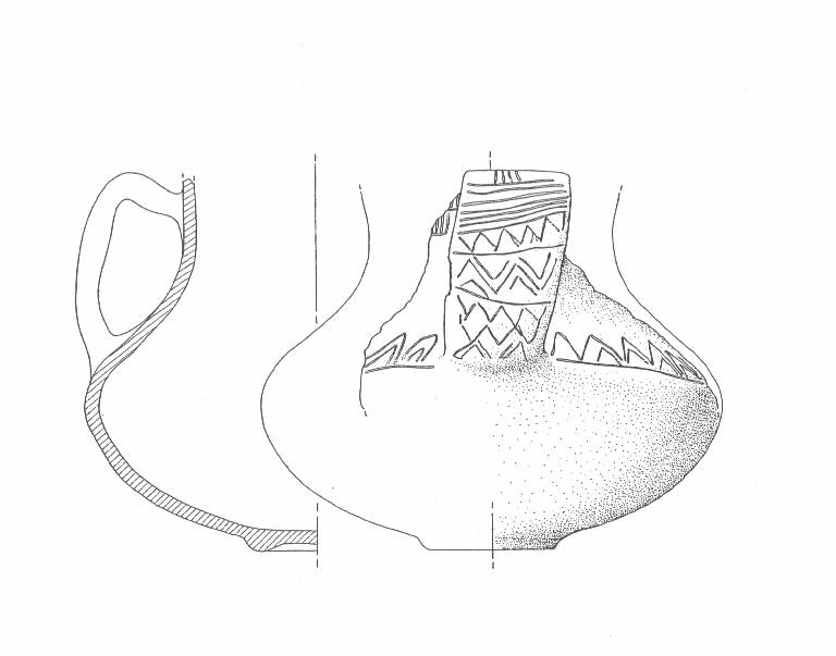 Profilo piriforme con ansa a nastro con profilo a gomito e base ad anello;decorazione a serie di linee incise orizzontali e verticali sul collo, linea incisa orizzontale lungo il diametro massimo sovrastata da una linea incisa a zig-zag in cui si iscrivono piccoli triangoli a margini aperti; ansa decorarta a linee incise orizzontali e verticali che sovrastano un motivo a zig-zag impostato su tre registri paralleli e di crescente spessore separati ognuno da una linea incisa orizzontale.