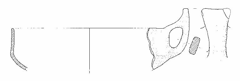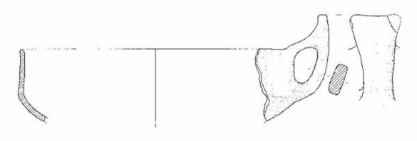 Frammento di capeduncola, con orlo arrotondato, corpo carenato a parete rettilinea, con diametro all'orlo leggermente minore del diametro alla carena, ansa a nastro verticale, soprelevata, ad ascia, con margine superiore leggermente concavo, impostata sull'orlo e sulla carena.