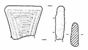 Frammento di ansa a nastro verticale, ad ascia, con margine superiore rettilineo. La faccia esterna dell'ansa è decorata da nove solcature parallele ed orizzontali, racchiuse tra due solcature verticali e parallele sulla destra e da due sulla sinistra.
