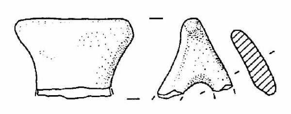 Frammento di ansa a nastro verticale, ad ascia, con margine superiore rettilineo ed apici sviluppati.