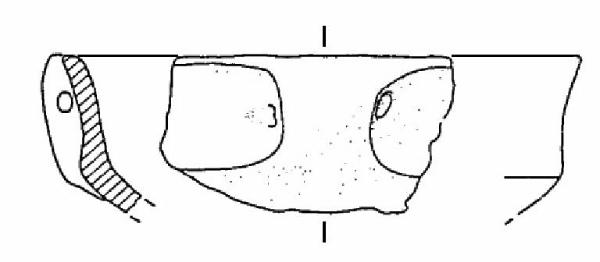 Scodella a profilo articolato, con orlo arrotondato, corpo carenato, a parete leggermente concava, con diametro all'orlo maggiore del diametro alla carena, vasca troncoconica, ansa canaliculata, impostata sull'orlo e sulla carena.
