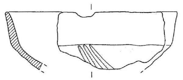 Scodella a profilo articolato, con orlo arrotondato, corpo carenato, a parete rettilinea, con diametro all'orlo maggiore del diametro alla carena, vasca troncoconica. Sotto la carena tre solcature parallele creano un motivo curvilineo.