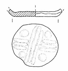 Fondo di scodella, piatto, decorato esternamente da solcature e coppelle, che delineano un motivo cruciforme.