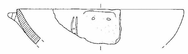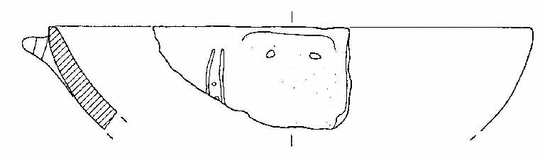 Frammento di scodellone a profilo continuo, con orlo arrotondato, corpo a calotta, una presa a linguetta con doppia perforazione verticale, impostata cinque mm sotto l'orlo. A fianco della presa ci sono due incisioni parallele e verticali, poste cinque mm l'una dall'altra, tra di esse ci sono due punti incisi.