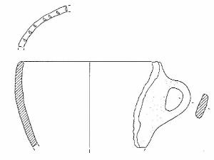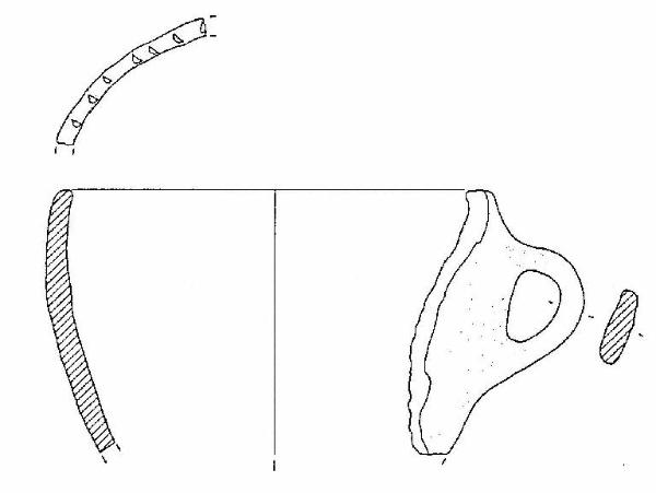 Boccale con orlo arrotondato, introflesso e decorato a tacche, corpo troncoconico, a parete leggermente convessa, ansa a nastro verticale, ad orecchio, impostata quindici mm sotto l'orlo.