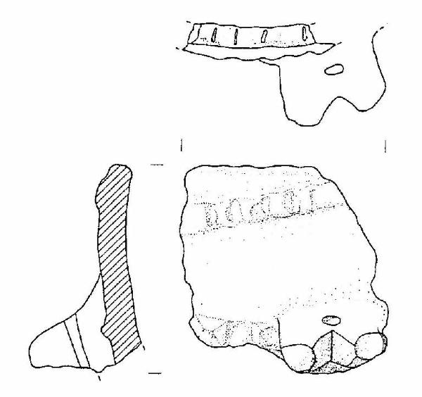 Frammento di dolio, con orlo arrotondato ed introflesso, decorato a tacche; dieci mm sotto l'orlo vi è un cordone plastico digitato; su un secondo cordone plastico digitato ed orizzontale è impostata una presa con due sporgenze e perforata verticalmente.