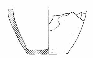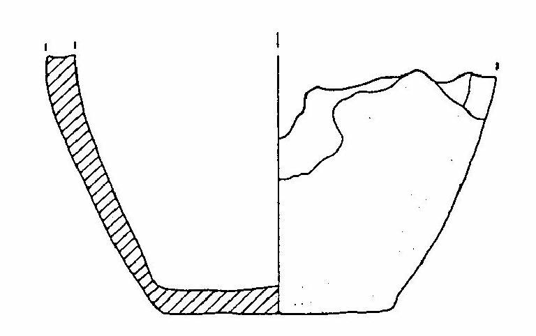 Frammento di vaso a corpo troncoconico, fondo piatto; si conserva l'attacco di un'ansa o presa.