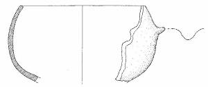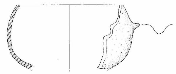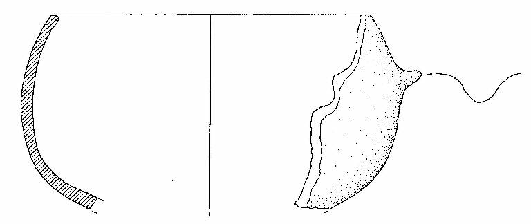 Frammento di vaso con orlo arrotondato ed inclinato verso l'interno, corpo ovoide. Vi è una presa a linguetta triangolare, impostata cinquanta mm sotto l'orlo.