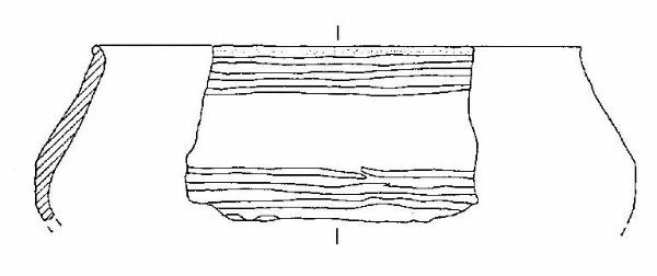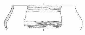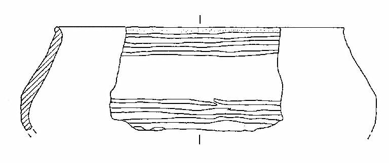 Frammento di vaso con orlo assottigliato e leggermente estroflesso, corpo biconico, decorato da due serie di tre solcature orizzontali e parallele, poste subito sotto l'orlo e lungo la massima espansione del vaso.