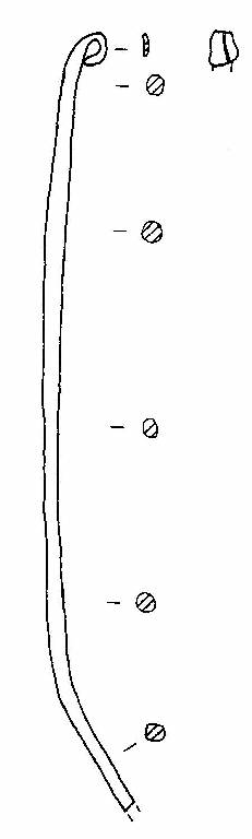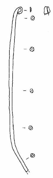 Spillone con capocchia a rotolo; sulla capocchia presenta una sottile solcatura. Il gambo è piegato ed ha sezione ovale. La superficie presenta una patina verde.