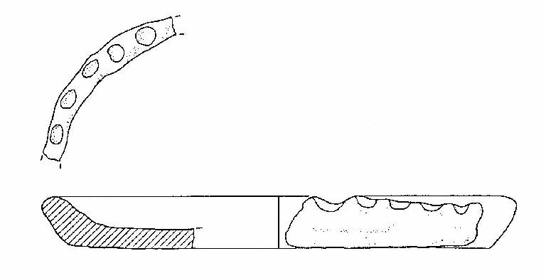 Piatto con orlo arrotondato, decorato ad impressioni digitali, parete svasata, fondo piatto. Colore bruno molto pallido.