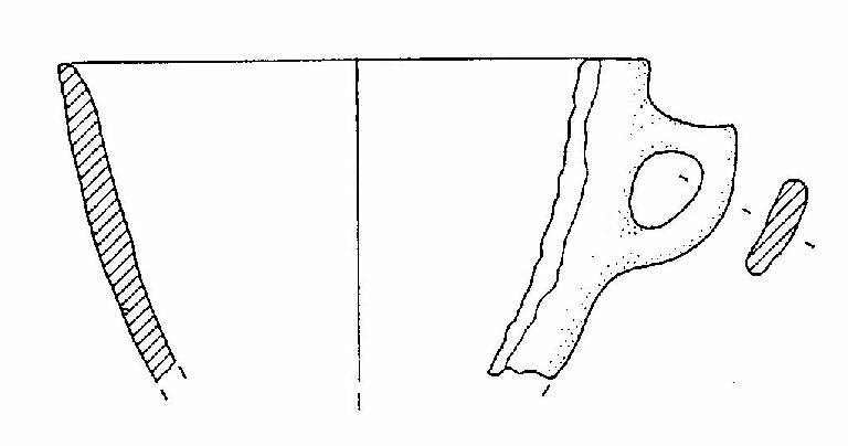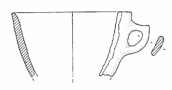 Tazza con orlo assottigliato, corpo troncoconico, ansa a nastro verticale, a gomito, con breve appendice asciforme, impostata otto mm sotto l'orlo. Colore grigio.