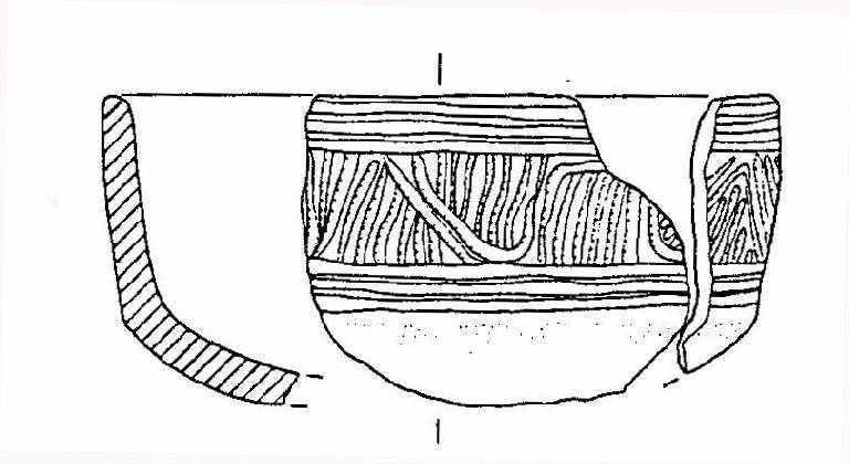 Capeduncola con orlo assottigliato, corpo carenato a parete rettilinea, con diametro all'orlo maggiore del diametro alla carena, vasca a calotta. Sotto l'orlo e sopra la carena ci sono tre solcature parallele ed orizzontali, che racchiudono uno spazio decorato da sottili solcature verticali, oblique e a festone.
