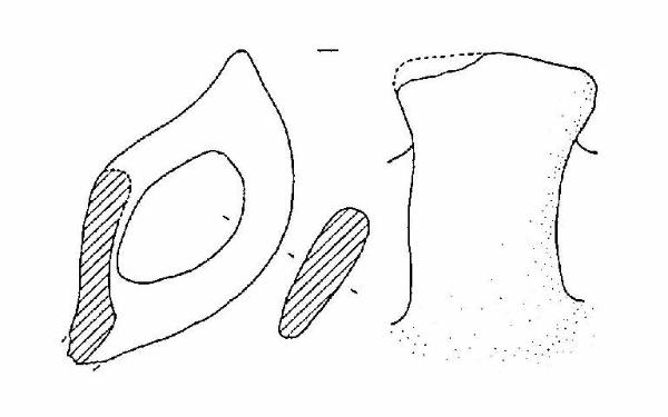 Frammento di capeduncola, con orlo arrotondato, corpo carenato, a parete leggermente concava, con diametro all'orlo uguale al diametro alla carena; ansa a nastro verticale, soprelevata, pizzuta, con margine superiore convesso, impostata sull'orlo e sulla carena.