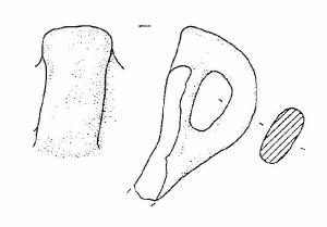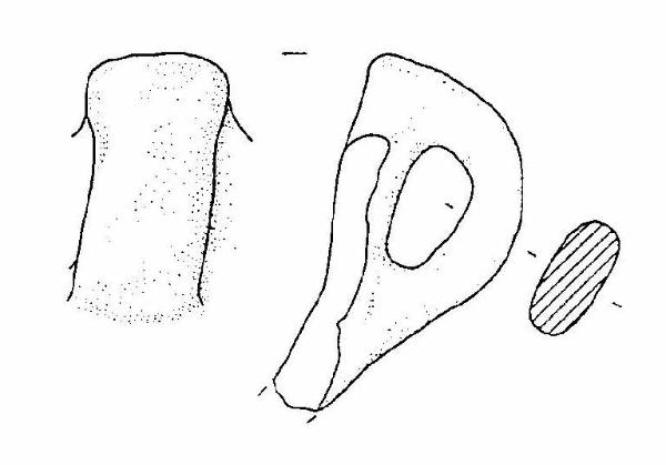 Frammento di capeduncola, con ansa a nastro verticale, soprelevata, pizzuta, con margine superiore rettilineo, impostata sull'orlo.