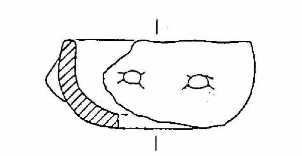 Scodella a profilo continuo, con orlo piatto, corpo semisferico, fondo convesso; sul corpo ci sono due bugne coniche. Colore grigio chiaro.