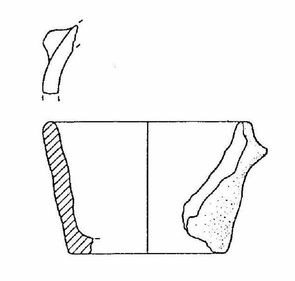 Scodella a profilo continuo, con orlo arrotondato, corpo troncoconico, fondo piatto, una presa impostata cinque mm sotto l'orlo.