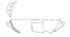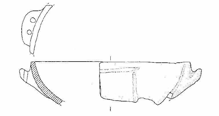 Scodella a profilo continuo, con orlo piatto, corpo a calotta, una presa con appendice asciforme e doppia perforazione verticale. La presa è posta tra due solcature verticali. In un altro punto della scodella vi sono due solcature tra loro perpendicolari. Colore giallo pallido.