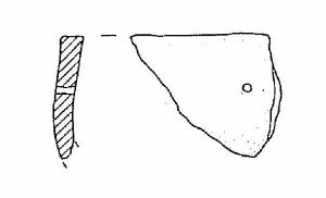 Scodella a profilo continuo, con orlo piatto, corpo semisferico, un foro passante posto diciotto mm sotto l'orlo. Colore grigio.