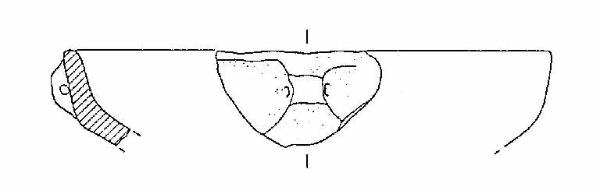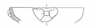 Scodella a profilo articolato, con orlo arrotondato, corpo carenato a parete rettilinea, con diametro all'orlo maggiore del diametro alla carena, ansa canaliculata, impostata su orlo e carena.