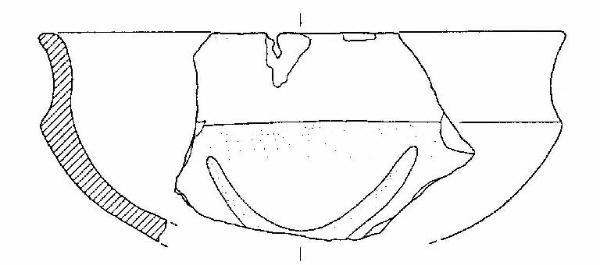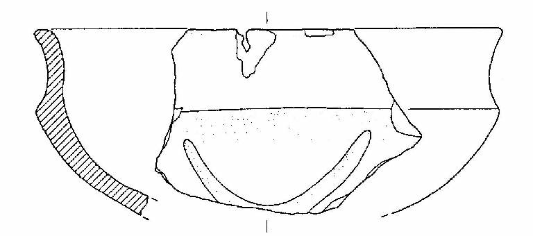 Scodella a profilo articolato, con orlo arrotondato ed estroflesso, corpo carenato, a parete concava, con diametro all'orlo uguale al diametro alla carena. Sotto la carena una solcatura delinea un motivo a "U".
