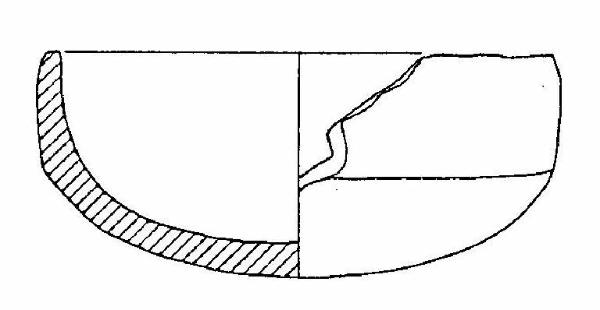 Frammento carenato di scodella o capeduncola, con orlo arrotondato e leggermente introflesso, corpo carenato, a parete rettilinea, con diametro all'orlo uguale al diametro alla carena, vasca a calotta, fondo convesso.