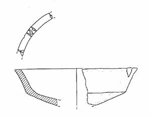 Frammento carenato di scodella o capeduncola, con orlo piatto e leggermente estroflesso, corpo carenato, a parete rettilinea, con diametro all'orlo maggiore del diametro alla carena, vasca troncoconica. L'orlo è decorato da tre tacche parallele e questo motivo sembra ripetersi con regolarità, alla distanza di circa quindici mm