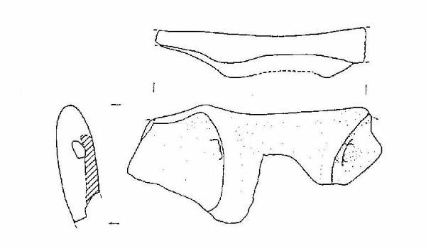 Scodellone a profilo articolato, con orlo arrotondato e leggermente estroflesso, ansa canaliculata con margine superiore insellato e soprelevata.