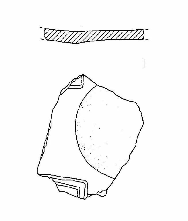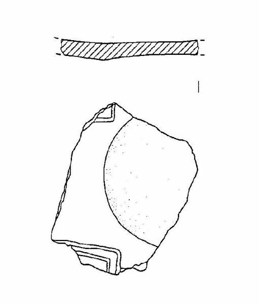 Frammento di fondo di scodellone, decorato da incisioni rettilinee, appartenenti probabilmente ad un motivo cruciforme.
