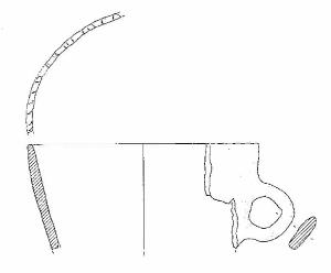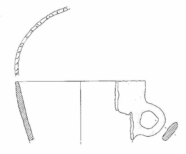 Vaso con orlo assottigliato, decorato a tacche, corpo troncoconico, ansa a nastro verticale, ad anello, impostata trenta mm sotto l'orlo.