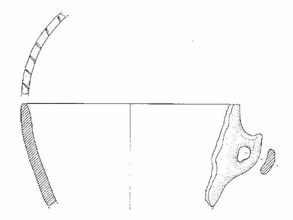 Vaso con orlo piatto, decorato a tacche, corpo troncoconico, ansa a nastro verticale, a gomito, con appendice asciforme, impostata trenta mm sotto l'orlo.