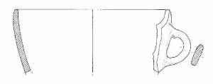 Vaso con orlo piatto, corpo troncoconico, ansa a nastro verticale, ad orecchio.