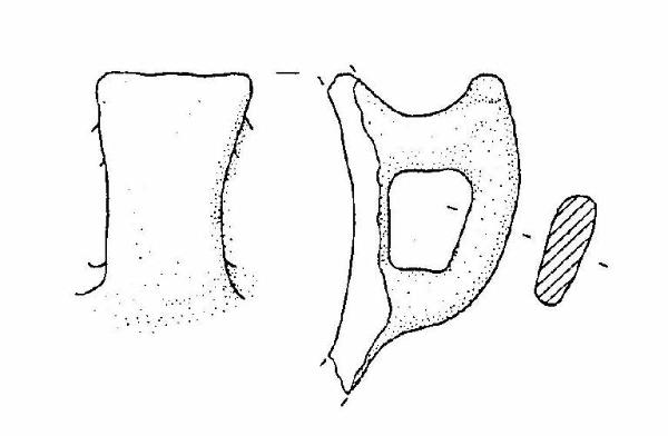 Frammento di ansa a nastro verticale, non soprelevata, ad ascia, con margine superiore rettilineo. Colore bruno molto pallido.