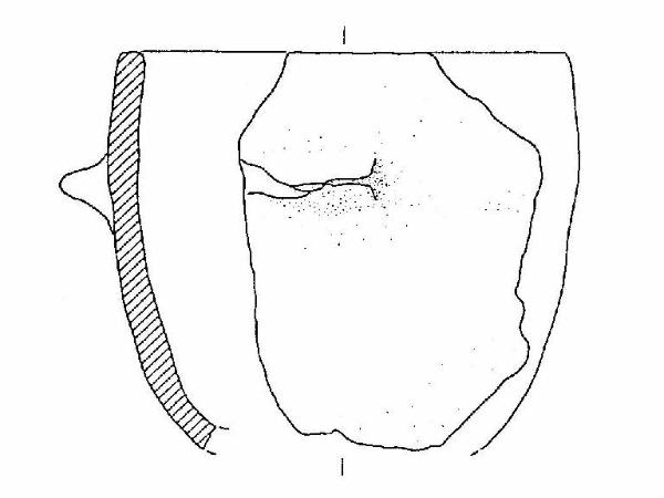 Vaso con orlo arrotondato, corpo troncoconico a parete convessa, una presa a linguetta, impostata ventisette mm sotto l'orlo. La superficie interna presenta incrostazioni di colore marrone. Colore grigio chiaro.