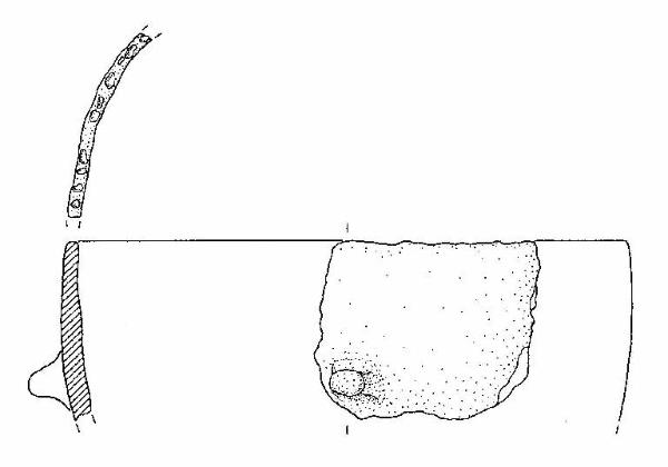 Dolio con orlo arrotondato, decorato ad impressioni digitali, corpo troncoconico; sessantacinque mm sotto l'orlo è impostata una presa.