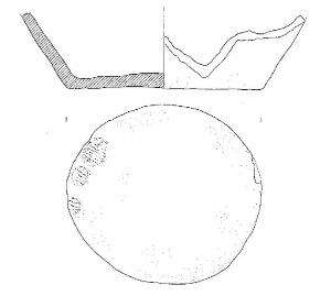 Vaso a corpo troncoconico, fondo piatto; sul fondo esterno sono visibili tre motivi plastici di forma ovale, campiti da solcature parallele.