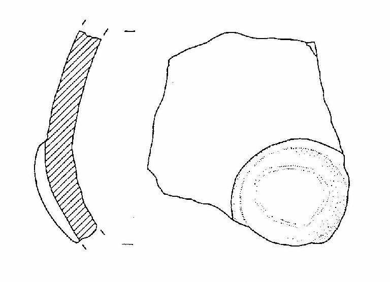 Frammento di vaso a corpo presumibilmente biconico; sulla parete vi è una bugna circolare, contornata da una solcatura. Sulla bugna è visibile una sottile solcatura, che delinea un motivo ovoidale. Colore bruno molto pallido.