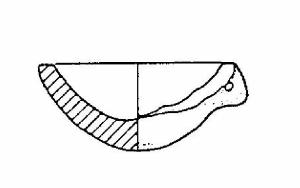 Vasetto miniaturistico, con orlo piatto, corpo a calotta, una piccola presa triangolare, perforata orizzontalmente.