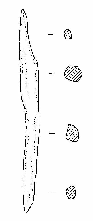 Strumento in osso, in corso di lavorazione. Lo strumento è appuntito ad entrambe le estremità e risulta rifinito in maniera grossolana. In fase di scavo è stato interpretato come probabile fuso, in quanto è stato rinvenuto in prossimità di una fusarola; i due reperti sono stati archiviati con lo stesso numero di inventario di scavo (reperto rilevato 12).