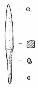 Punta di freccia, a base quadrangolare, con peduncolo arrotondato, con lunga punta.
