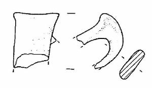 Frammento di ansa a nastro verticale, soprelevata, ad ascia, con margine superiore leggermente concavo e due piccole protuberanze coniche.