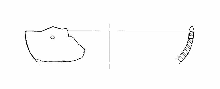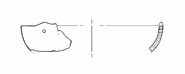 Orlo arrotondato, corpo a calotta. Sulla parete è visibile un foro passante circolare dal quale una linguetta triangolare si eleva di 0,5 cm al di sopra dell'orlo. All'estremità sinistra del frammento si intravedono forse un analogo foro ed un'analoga linguetta. Colore: grigio.