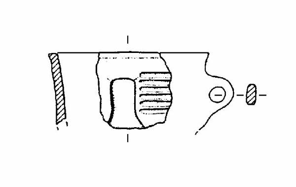 Tipo isolone. Parete debolmente concava con orlo piatto e leggermente esoverso e piccola ansa a nastro verticale, ad anello, impostata 1,2 cm sotto l'orlo. Decorazione a solcature sulla parete. Colore: grigio.