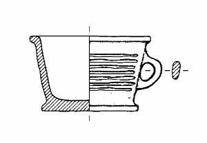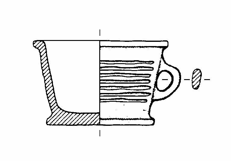 TIPO ISOLONE. Orlo ingrossato, appiattito ed esoverso. Corpo troncoconico a parete rettilinea. Fondo piatto a tacco. Ansa a nastro verticale, ad anello, impostata a metà del corpo. Decorazione a solcature sulla parete. Colore: grigio.
